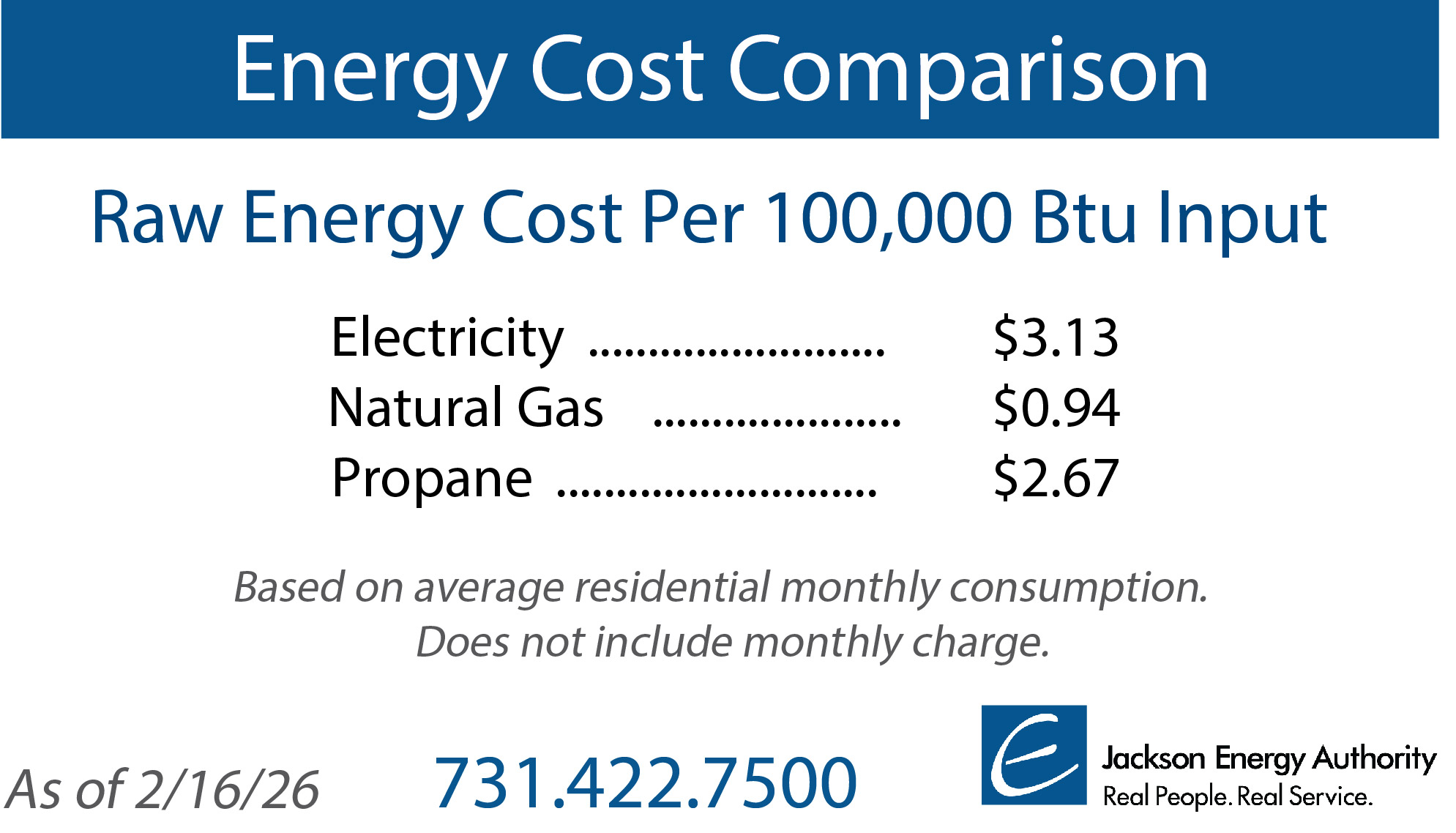 Jackson Energy Authority aims to offer the tools needed for contractors and developers to make informed decisions when building their next project. The Energy Cost Comparison below is a tool that provides the current raw energy costs to help the contractor/developer make an educated decision on energy efficiency when designing a new home, business or facility. It is simply a reference of raw energy costs and not intended to be an exhaustive, comprehensive resource. Other factors such as appliance costs, installation costs, impact of efficiency ratings, return on investment, appliance quality and durability, etc. should be considered as well.