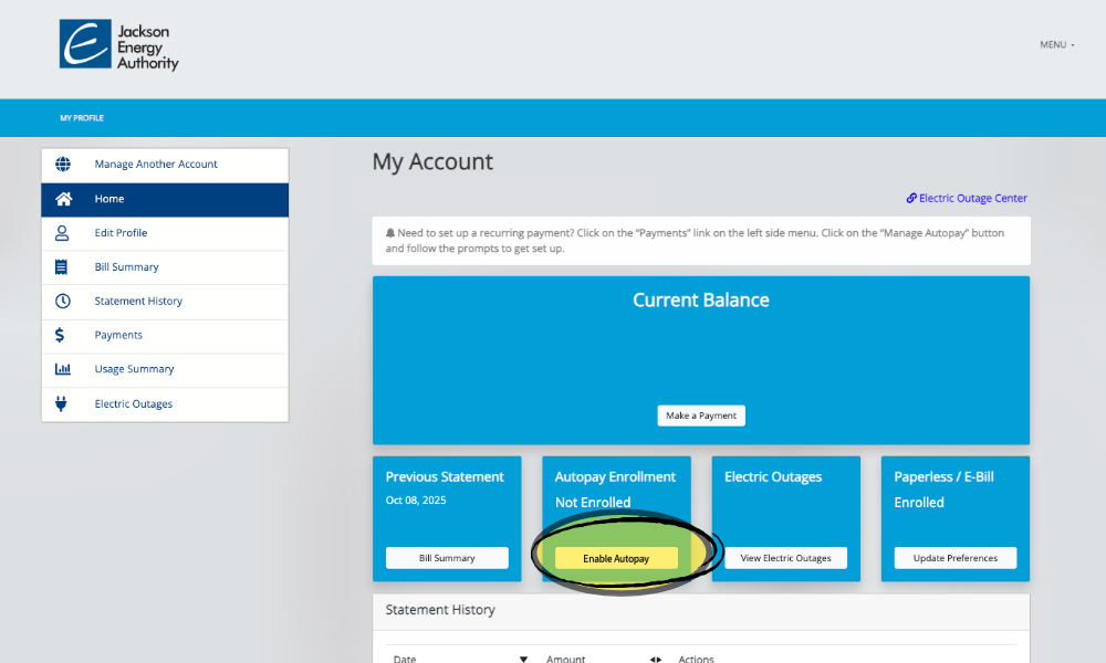 As of June 8, recurring payments should be set up in the new portal by using the "Autopay" feature. If you currently have a payment scheduled after June 7 in the JEA MyBill portal, it needs to be scheduled in the new online account management portal to avoid any delays in payment.