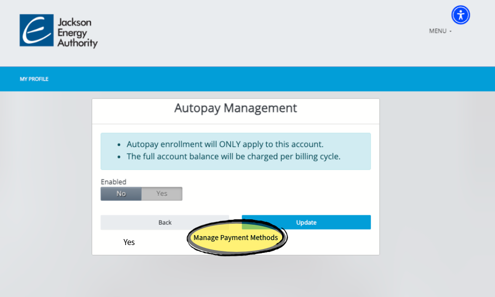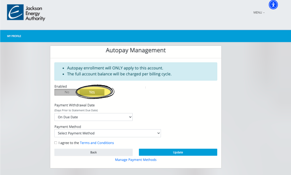 - Click “Yes” to enable autopay then select your preferred withdrawal date and payment method. Check the box to agree to Terms and Conditions, then click the blue “Update” button.